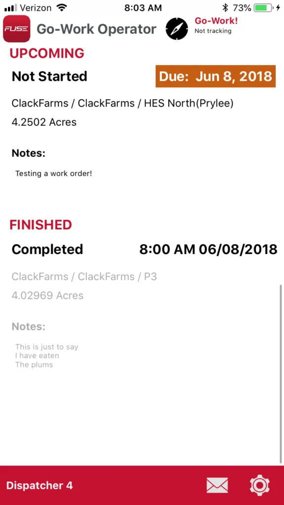 A central user in the dispatch center listed the equipment and operators available to the company, created field outlines, and dispatched work requests to those operators. Each operator was provided a login to the web-based and mobile application. When work assignments were issued, the operator was notified. Operators could update their status, such as In Progress, Completed or Issues Encountered that needed attention.